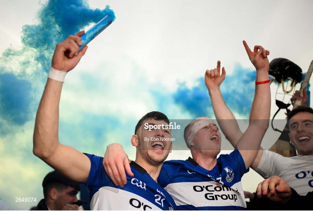 15 October 2023; Daragh Long, left, and Daniel Hogan of Sarsfields celebrate with team-mates after the Cork County Premier Senior Club Hurling Championship final between Sarsfields and Midleton at Páirc Uí Chaoimh in Cork. Photo by Eóin Noonan/Sportsfile