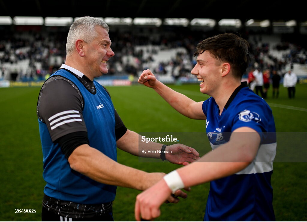 15 October 2023; Colm McCarthy of Sarsfields celebrates with Sarsfields selector Diarmuid O'Sullivan after the Cork County Premier Senior Club Hurling Championship final between Sarsfields and Midleton at Páirc Uí Chaoimh in Cork. Photo by Eóin Noonan/Sportsfile