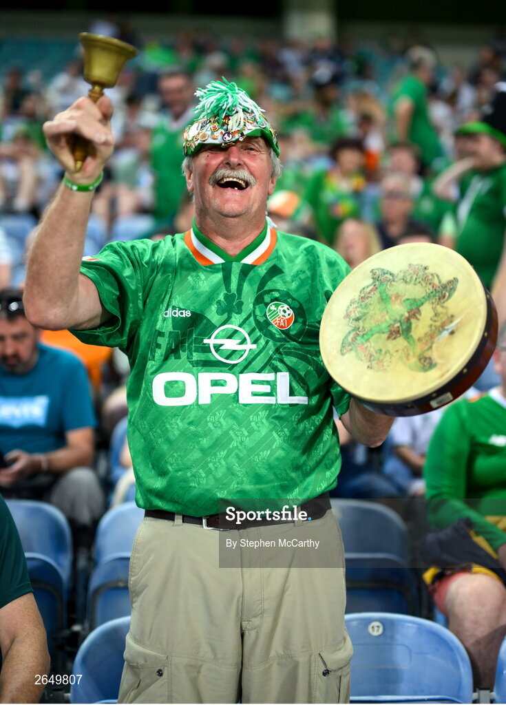 16 October 2023; Republic of Ireland supporter Jimmy 'The Bell' Finnerty before the UEFA EURO 2024 Championship qualifying group B match between Gibraltar and Republic of Ireland at Estádio Algarve in Faro, Portugal. Photo by Stephen McCarthy/Sportsfile