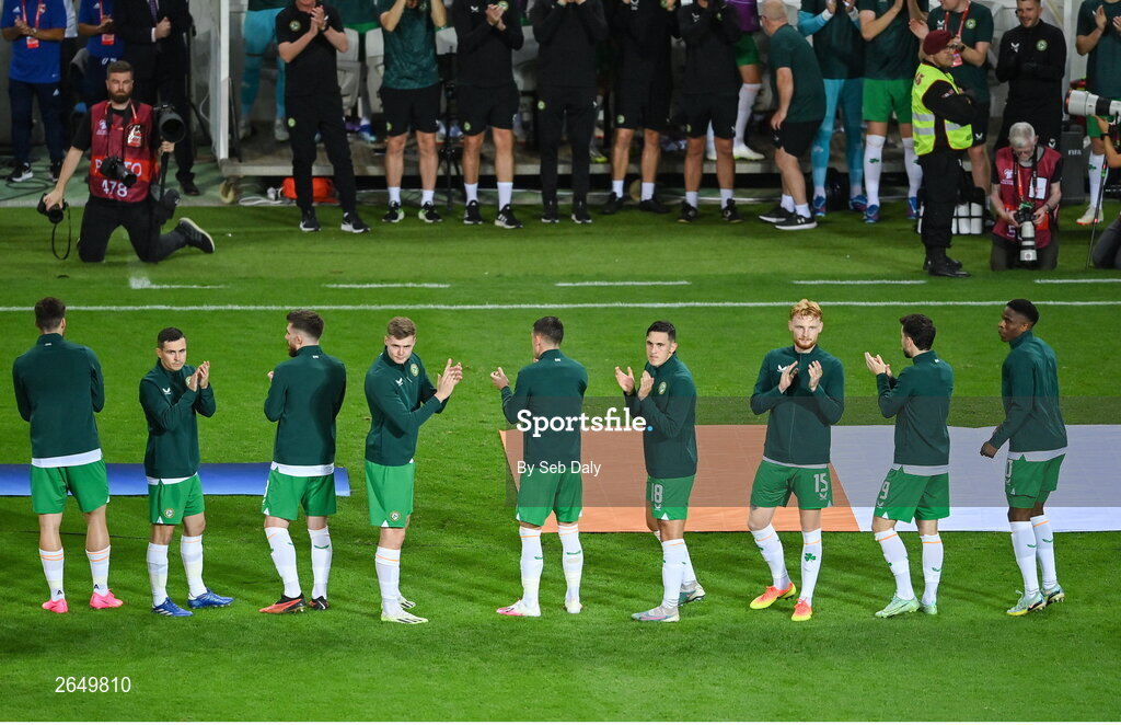 16 October 2023; Republic of Ireland players turn to acknowledge supporters following the national anthem before the UEFA EURO 2024 Championship qualifying group B match between Gibraltar and Republic of Ireland at Estádio Algarve in Faro, Portugal. Photo by Seb Daly/Sportsfile