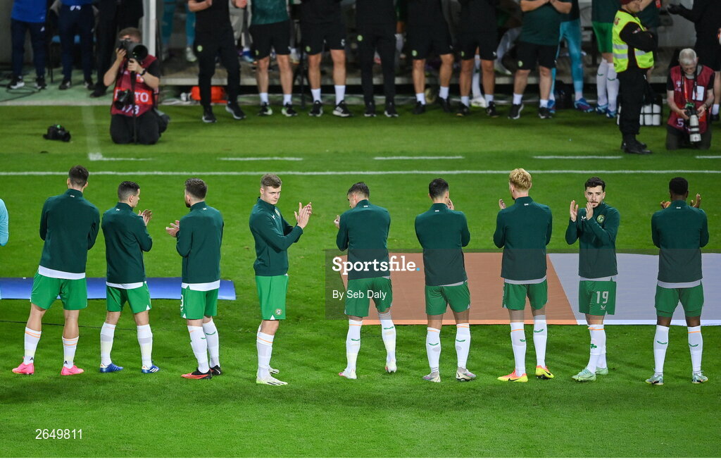 16 October 2023; Evan Ferguson and Mikey Johnston of Republic of Ireland turn to acknowledge supporters following the national anthem before the UEFA EURO 2024 Championship qualifying group B match between Gibraltar and Republic of Ireland at Estádio Algarve in Faro, Portugal. Photo by Seb Daly/Sportsfile