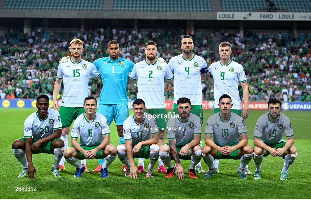 16 October 2023; The Republic of Ireland team, back row, from left, Liam Scales, goalkeeper Gavin Bazunu, Matt Doherty, Shane Duffy and Evan Ferguson. Front row, from left, Chiedozie Ogbene, Josh Cullen, Jason Knight, Ryan Manning, Jamie McGrath and Mikey Johnston before the UEFA EURO 2024 Championship qualifying group B match between Gibraltar and Republic of Ireland at Estádio Algarve in Faro, Portugal. Photo by Stephen McCarthy/Sportsfile
