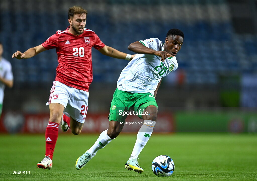16 October 2023; Chiedozie Ogbene of Republic of Ireland in action against Ethan Britto of Gibraltar during the UEFA EURO 2024 Championship qualifying group B match between Gibraltar and Republic of Ireland at Estádio Algarve in Faro, Portugal. Photo by Stephen McCarthy/Sportsfile