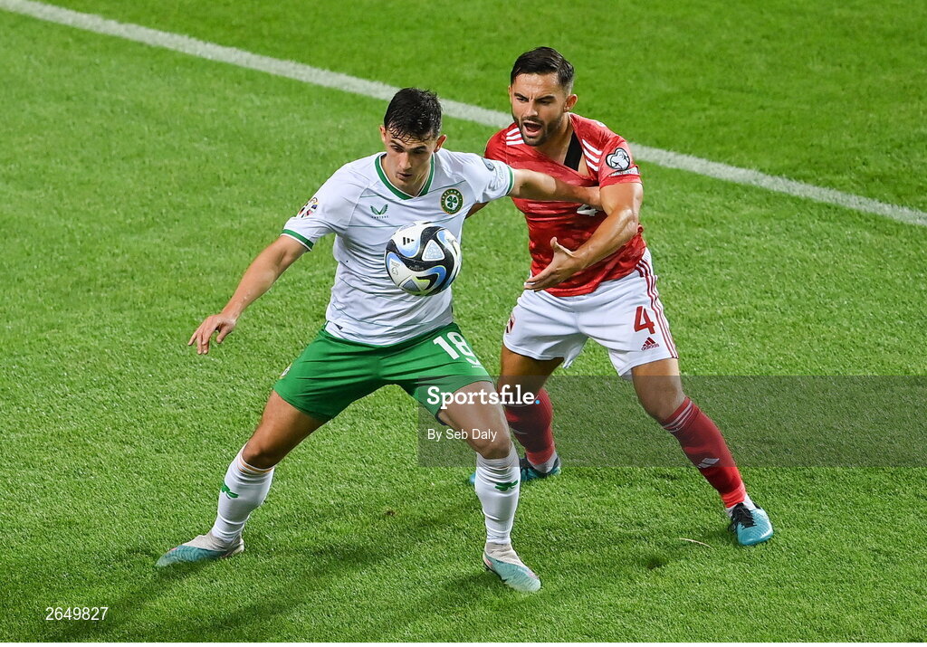 16 October 2023; Jamie McGrath of Republic of Ireland in action against John Sergeant of Gibraltar during the UEFA EURO 2024 Championship qualifying group B match between Gibraltar and Republic of Ireland at Estádio Algarve in Faro, Portugal. Photo by Seb Daly/Sportsfile