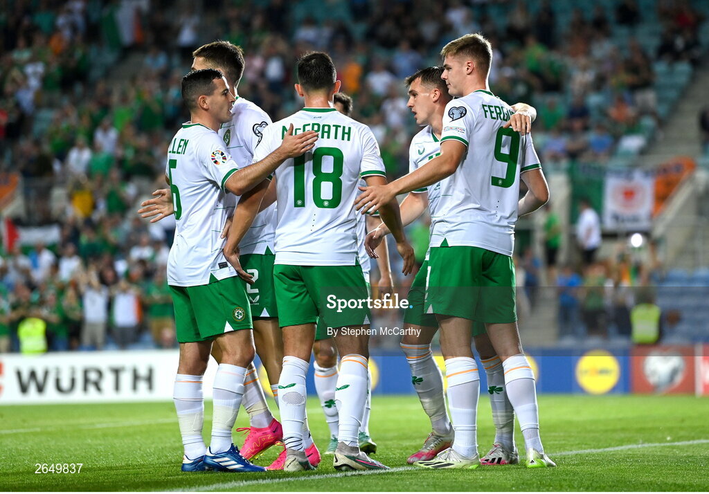 16 October 2023; Evan Ferguson of Republic of Ireland, right, with teammates after scoring their side's first goal during the UEFA EURO 2024 Championship qualifying group B match between Gibraltar and Republic of Ireland at Estádio Algarve in Faro, Portugal. Photo by Stephen McCarthy/Sportsfile