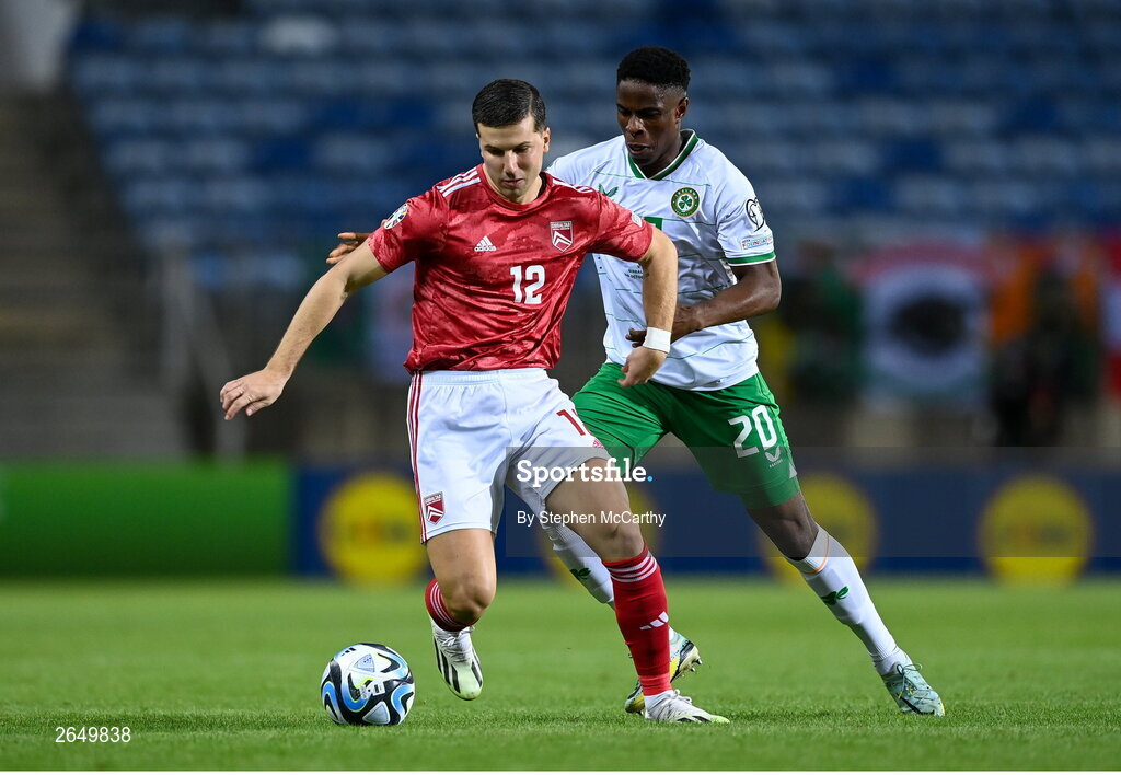 16 October 2023; Jayce Olivero of Gibraltar in action against Chiedozie Ogbene of Republic of Ireland during the UEFA EURO 2024 Championship qualifying group B match between Gibraltar and Republic of Ireland at Estádio Algarve in Faro, Portugal. Photo by Stephen McCarthy/Sportsfile