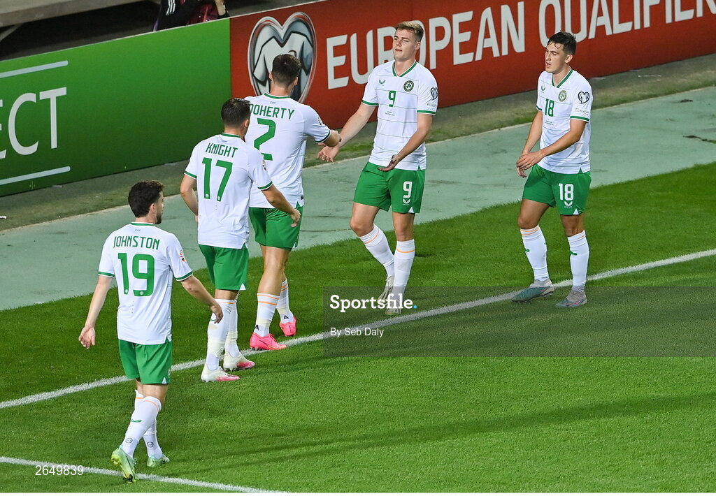 16 October 2023; Evan Ferguson of Republic of Ireland celebrates with teammates, including Jamie McGrath, right, and Matt Doherty, 2, during the UEFA EURO 2024 Championship qualifying group B match between Gibraltar and Republic of Ireland at Estádio Algarve in Faro, Portugal. Photo by Seb Daly/Sportsfile