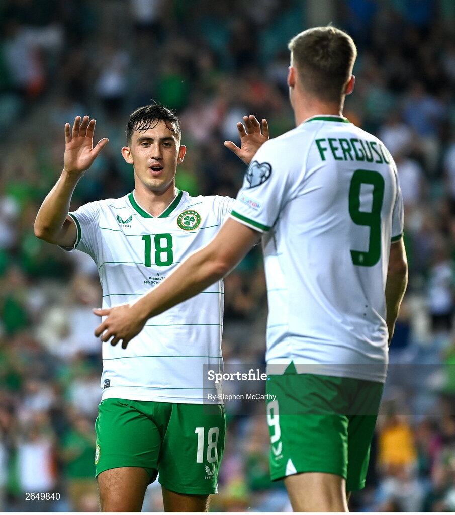 16 October 2023; Evan Ferguson of Republic of Ireland celebrates with teammates Jamie McGrath after scoring their side's first goal during the UEFA EURO 2024 Championship qualifying group B match between Gibraltar and Republic of Ireland at Estádio Algarve in Faro, Portugal. Photo by Stephen McCarthy/Sportsfile