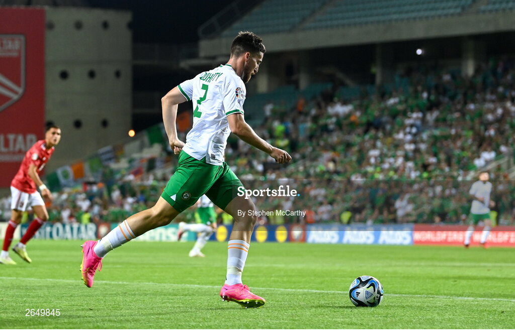 16 October 2023; Matt Doherty of Republic of Ireland in the lead up to his side's first goal, scored by Evan Ferguson, not pictured, during the UEFA EURO 2024 Championship qualifying group B match between Gibraltar and Republic of Ireland at Estádio Algarve in Faro, Portugal. Photo by Stephen McCarthy/Sportsfile