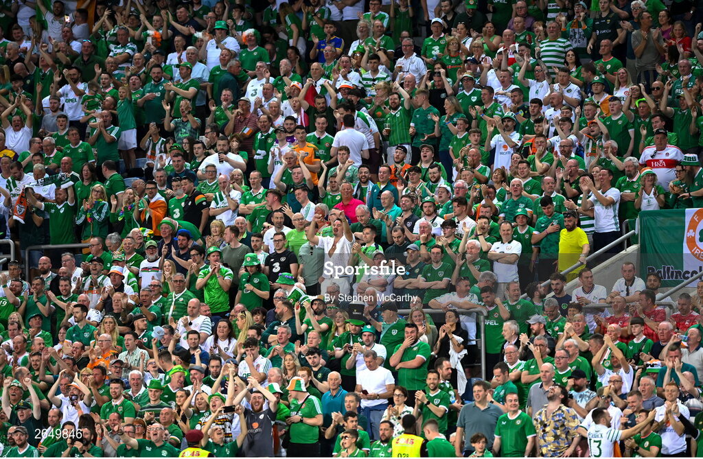 16 October 2023; Republic of Ireland supporters celebrate their side's first goal, scored by Evan Ferguson, during the UEFA EURO 2024 Championship qualifying group B match between Gibraltar and Republic of Ireland at Estádio Algarve in Faro, Portugal. Photo by Stephen McCarthy/Sportsfile