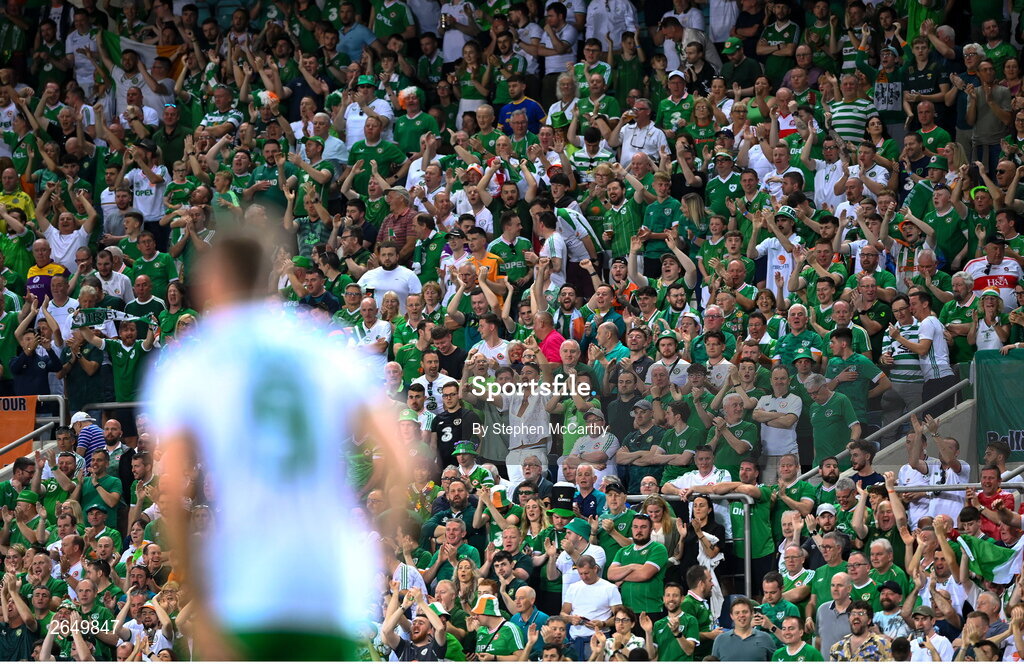 16 October 2023; Republic of Ireland supporters celebrate their side's first goal, scored by Evan Ferguson, during the UEFA EURO 2024 Championship qualifying group B match between Gibraltar and Republic of Ireland at Estádio Algarve in Faro, Portugal. Photo by Stephen McCarthy/Sportsfile