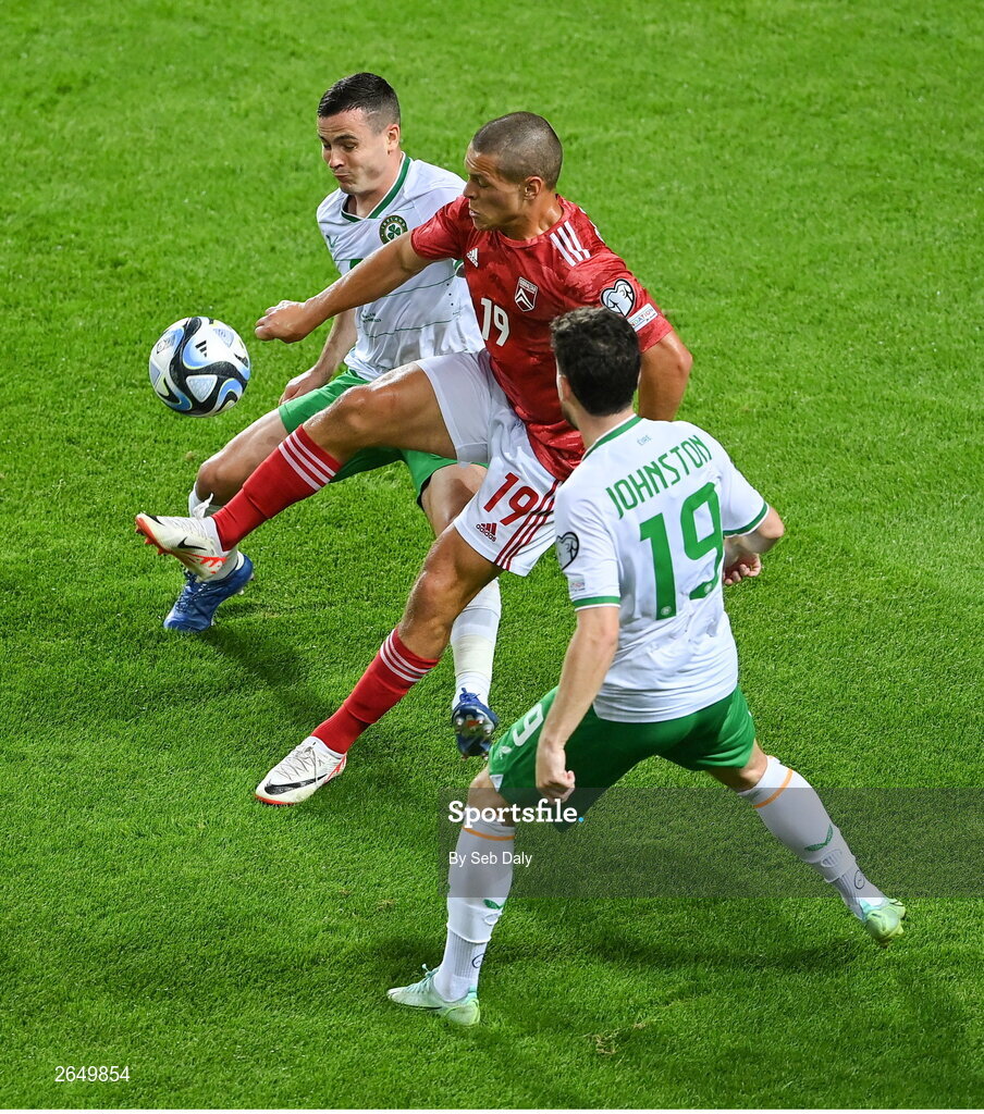 16 October 2023; Tjay De Barr of Gibraltar in action against Josh Cullen, left, and Mikey Johnston of Republic of Ireland during the UEFA EURO 2024 Championship qualifying group B match between Gibraltar and Republic of Ireland at Estádio Algarve in Faro, Portugal. Photo by Seb Daly/Sportsfile