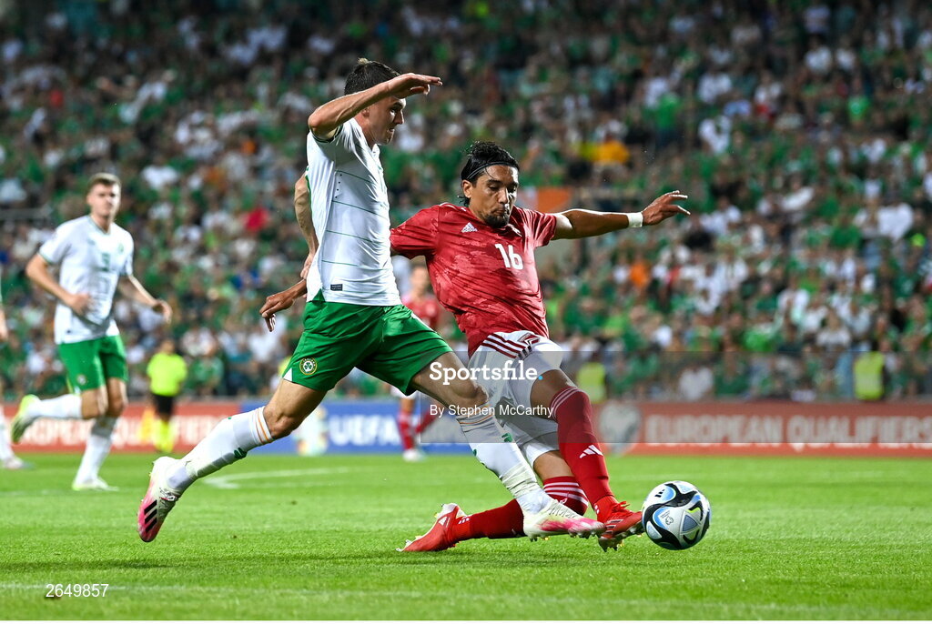 16 October 2023; Jason Knight of Republic of Ireland in action against Aymen Mouelhi of Gibraltar during the UEFA EURO 2024 Championship qualifying group B match between Gibraltar and Republic of Ireland at Estádio Algarve in Faro, Portugal. Photo by Stephen McCarthy/Sportsfile