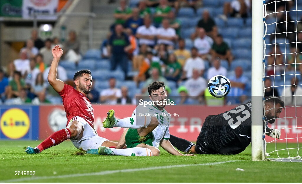 16 October 2023; Mikey Johnston of Republic of Ireland scores his side's second goal past Gibraltar goalkeeper Dayle Coleing during the UEFA EURO 2024 Championship qualifying group B match between Gibraltar and Republic of Ireland at Estádio Algarve in Faro, Portugal. Photo by Stephen McCarthy/Sportsfile