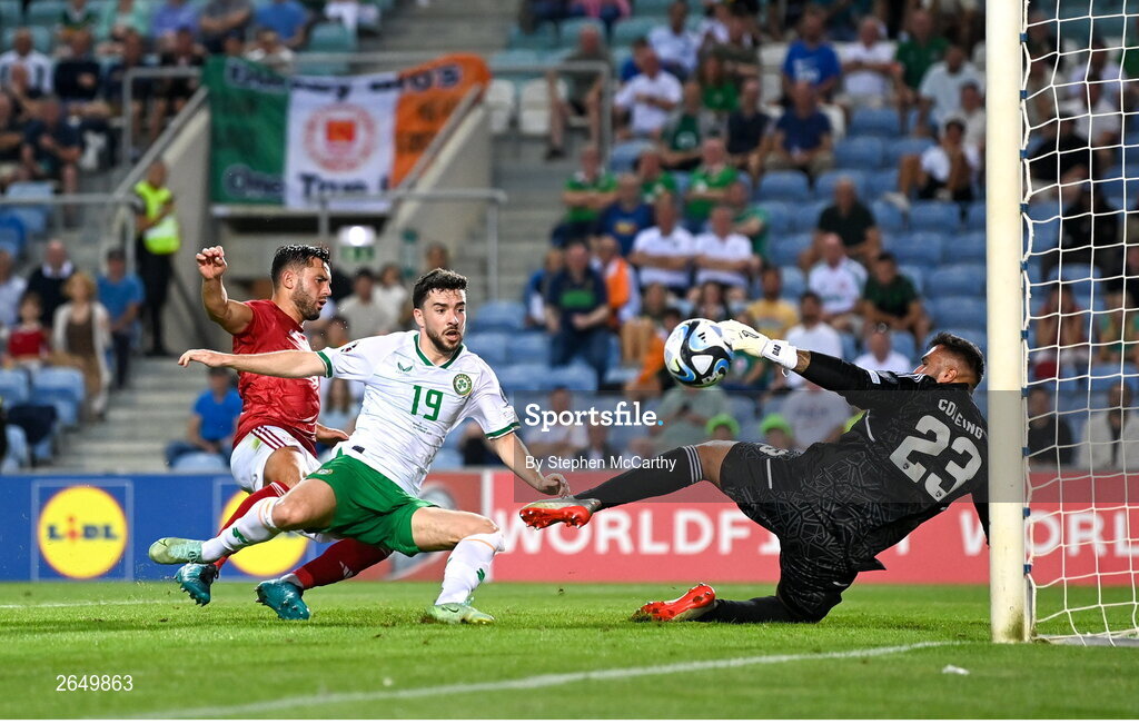16 October 2023; Mikey Johnston of Republic of Ireland scores his side's second goal past Gibraltar goalkeeper Dayle Coleing during the UEFA EURO 2024 Championship qualifying group B match between Gibraltar and Republic of Ireland at Estádio Algarve in Faro, Portugal. Photo by Stephen McCarthy/Sportsfile