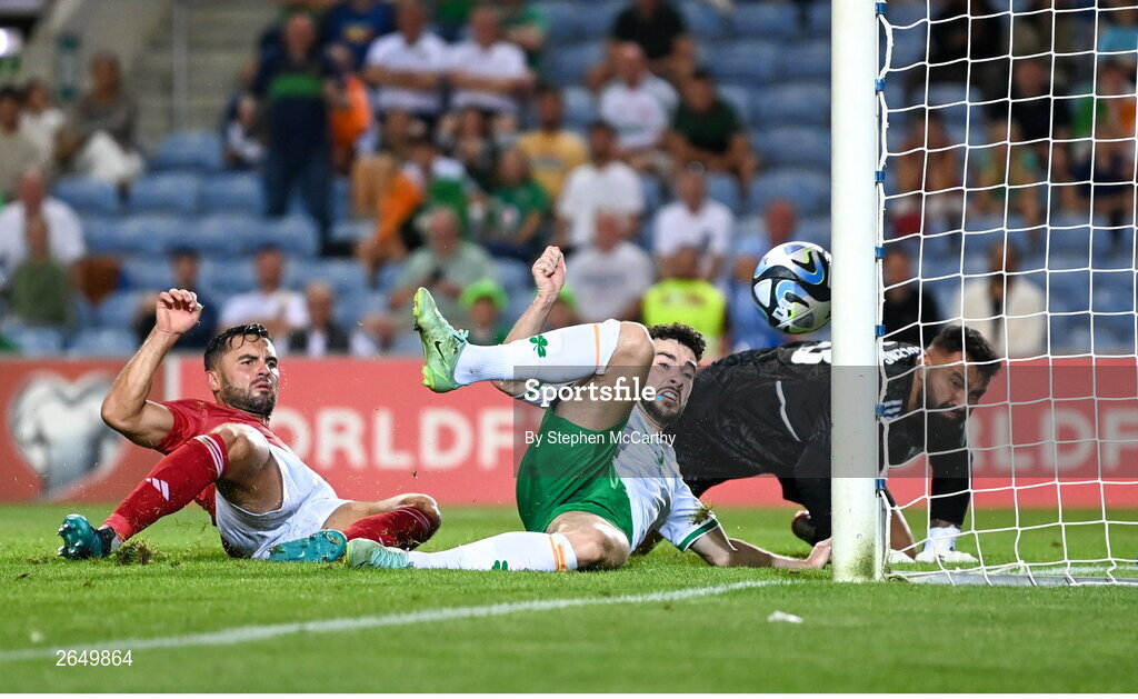 16 October 2023; Mikey Johnston of Republic of Ireland scores his side's second goal past Gibraltar goalkeeper Dayle Coleing during the UEFA EURO 2024 Championship qualifying group B match between Gibraltar and Republic of Ireland at Estádio Algarve in Faro, Portugal. Photo by Stephen McCarthy/Sportsfile