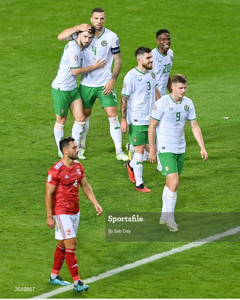 16 October 2023; Mikey Johnston of Republic of Ireland, left, celebrates with team-mate Shane Duffy after scoring their side's second goal during the UEFA EURO 2024 Championship qualifying group B match between Gibraltar and Republic of Ireland at Estádio Algarve in Faro, Portugal. Photo by Seb Daly/Sportsfile