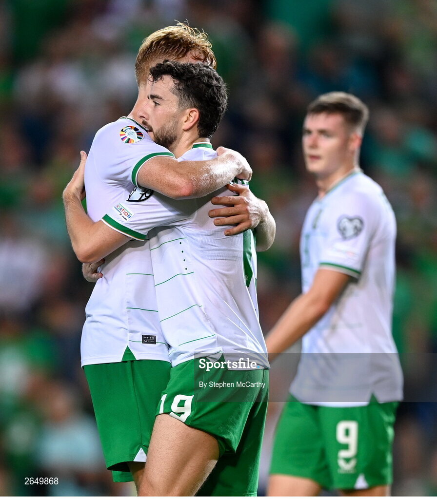 16 October 2023; Mikey Johnston of Republic of Ireland celebrates with teammate Liam Scales, left, after scoring their side's second goal during the UEFA EURO 2024 Championship qualifying group B match between Gibraltar and Republic of Ireland at Estádio Algarve in Faro, Portugal. Photo by Stephen McCarthy/Sportsfile