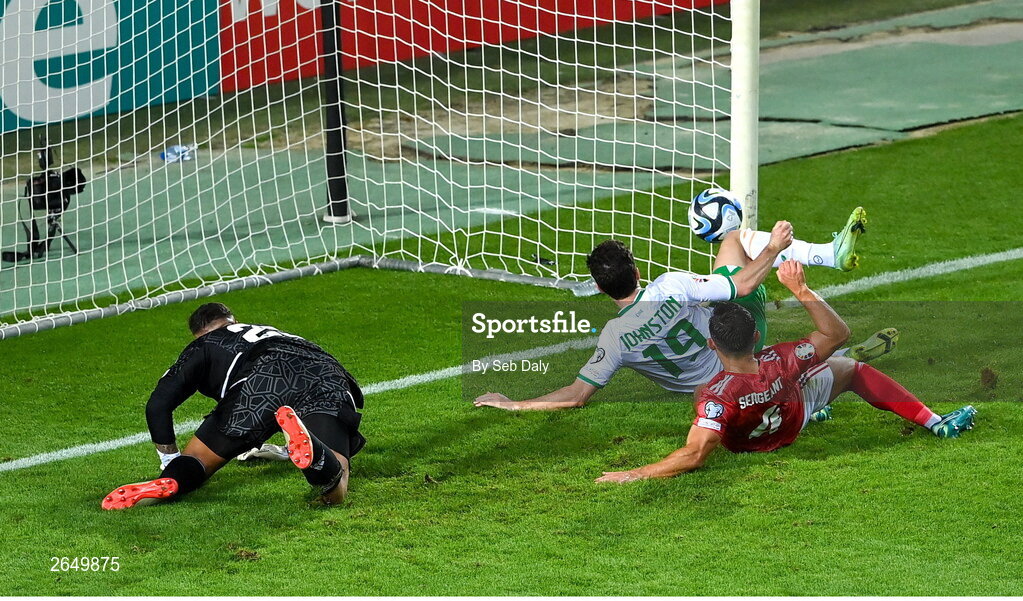 16 October 2023; Mikey Johnston of Republic of Ireland scores his side's second goal during the UEFA EURO 2024 Championship qualifying group B match between Gibraltar and Republic of Ireland at Estádio Algarve in Faro, Portugal. Photo by Seb Daly/Sportsfile