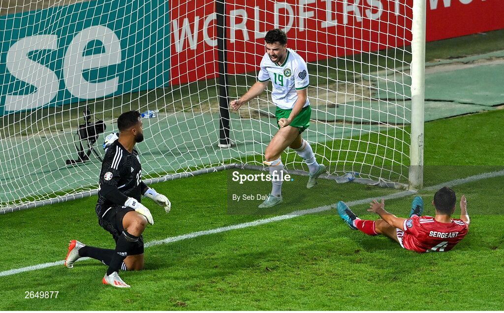 16 October 2023; Mikey Johnston of Republic of Ireland celebrates after scoring his side's second goal during the UEFA EURO 2024 Championship qualifying group B match between Gibraltar and Republic of Ireland at Estádio Algarve in Faro, Portugal. Photo by Seb Daly/Sportsfile