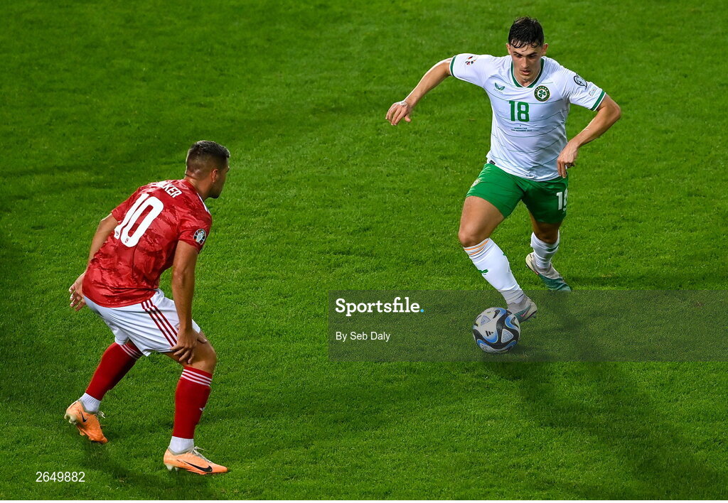 16 October 2023; Jamie McGrath of Republic of Ireland in action against Liam Walker of Gibraltar during the UEFA EURO 2024 Championship qualifying group B match between Gibraltar and Republic of Ireland at Estádio Algarve in Faro, Portugal. Photo by Seb Daly/Sportsfile