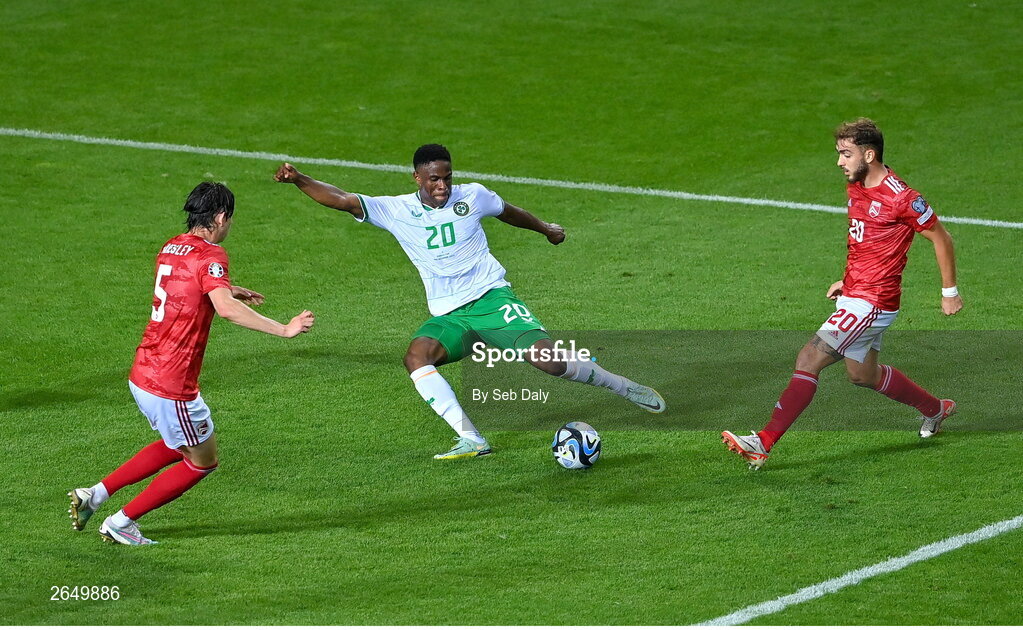 16 October 2023; Chiedozie Ogbene of Republic of Ireland in action against Louie Annesley, left, and Ethan Britto of Gibraltar during the UEFA EURO 2024 Championship qualifying group B match between Gibraltar and Republic of Ireland at Estádio Algarve in Faro, Portugal. Photo by Seb Daly/Sportsfile