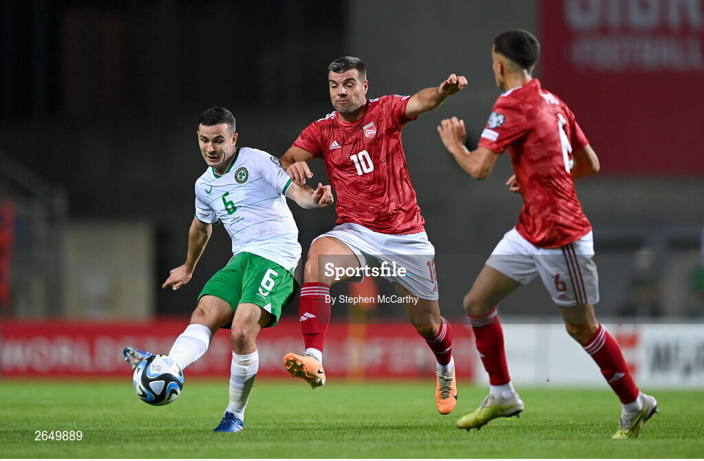 16 October 2023; Josh Cullen of Republic of Ireland in action against Liam Walker of Gibraltar during the UEFA EURO 2024 Championship qualifying group B match between Gibraltar and Republic of Ireland at Estádio Algarve in Faro, Portugal. Photo by Stephen McCarthy/Sportsfile