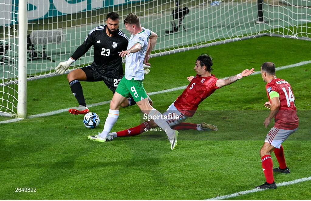 16 October 2023; Evan Ferguson of Republic of Ireland in action against Louie Annesley, second from right, and Gibraltar goalkeeper Dayle Coleing during the UEFA EURO 2024 Championship qualifying group B match between Gibraltar and Republic of Ireland at Estádio Algarve in Faro, Portugal. Photo by Seb Daly/Sportsfile