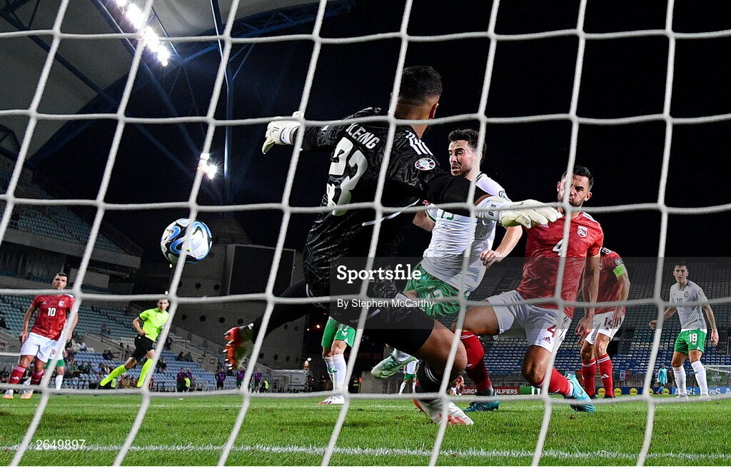 16 October 2023; Mikey Johnston of Republic of Ireland scores his side's second goal past Gibraltar goalkeeper Dayle Coleing during the UEFA EURO 2024 Championship qualifying group B match between Gibraltar and Republic of Ireland at Estádio Algarve in Faro, Portugal. Photo by Stephen McCarthy/Sportsfile