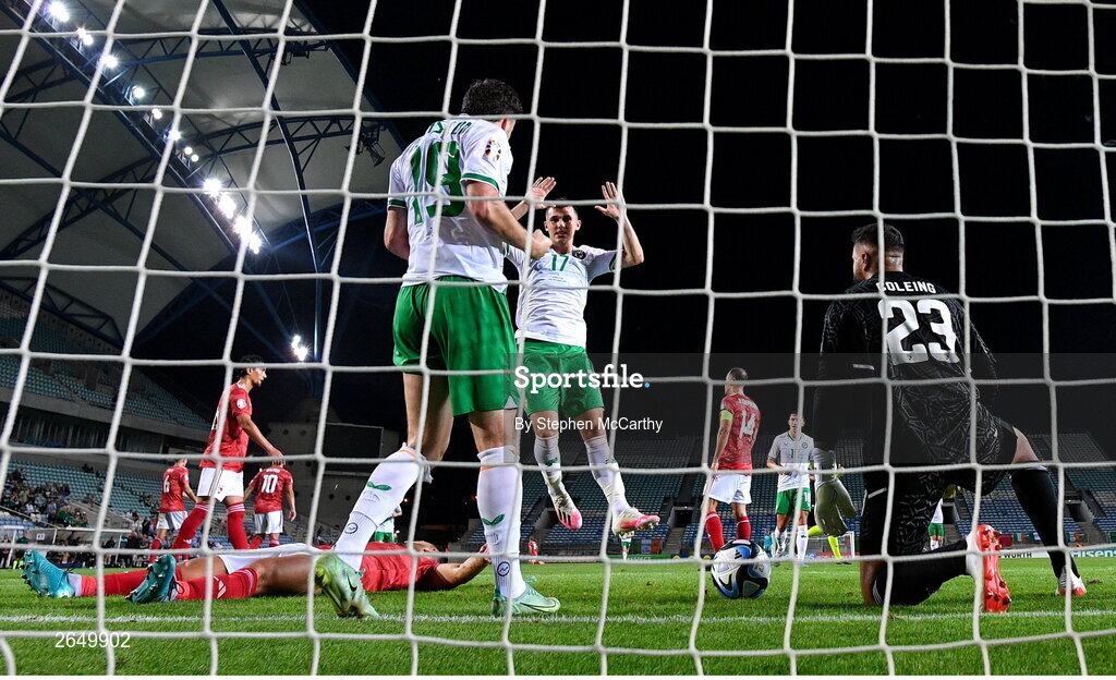 16 October 2023; Mikey Johnston of Republic of Ireland celebrates with teammate Jason Knight, right, after scoring their side's second goal during the UEFA EURO 2024 Championship qualifying group B match between Gibraltar and Republic of Ireland at Estádio Algarve in Faro, Portugal. Photo by Stephen McCarthy/Sportsfile