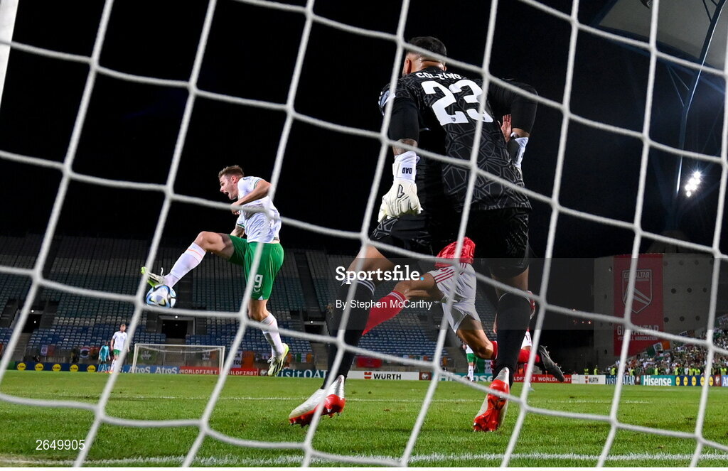 16 October 2023; Evan Ferguson of Republic of Ireland scores his side's first goal past Gibraltar goalkeeper Dayle Coleing during the UEFA EURO 2024 Championship qualifying group B match between Gibraltar and Republic of Ireland at Estádio Algarve in Faro, Portugal. Photo by Stephen McCarthy/Sportsfile