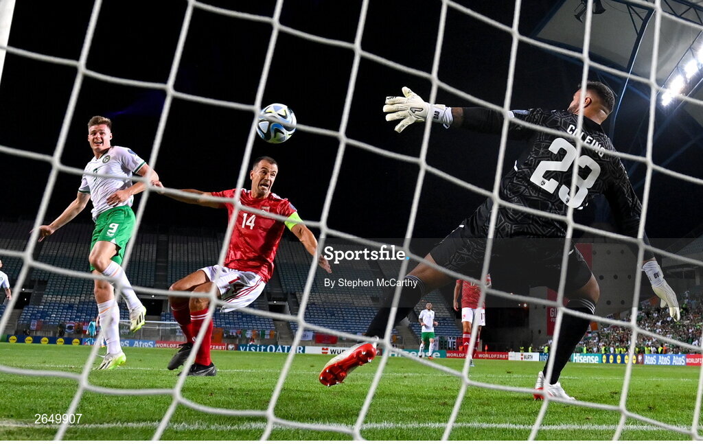 16 October 2023; Evan Ferguson of Republic of Ireland scores his side's first goal past Gibraltar goalkeeper Dayle Coleing during the UEFA EURO 2024 Championship qualifying group B match between Gibraltar and Republic of Ireland at Estádio Algarve in Faro, Portugal. Photo by Stephen McCarthy/Sportsfile