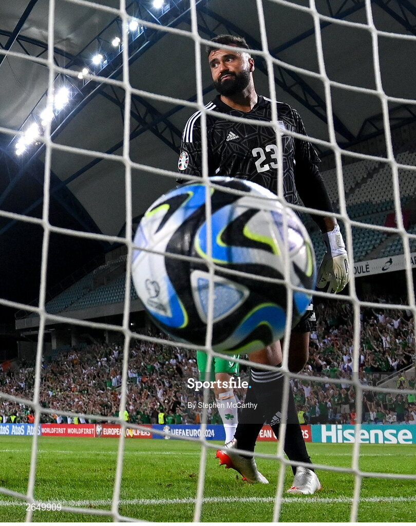 16 October 2023; Gibraltar goalkeeper Dayle Coleing reacts after conceding his side's first goal, scored by Evan Ferguson, not pictured, during the UEFA EURO 2024 Championship qualifying group B match between Gibraltar and Republic of Ireland at Estádio Algarve in Faro, Portugal. Photo by Stephen McCarthy/Sportsfile