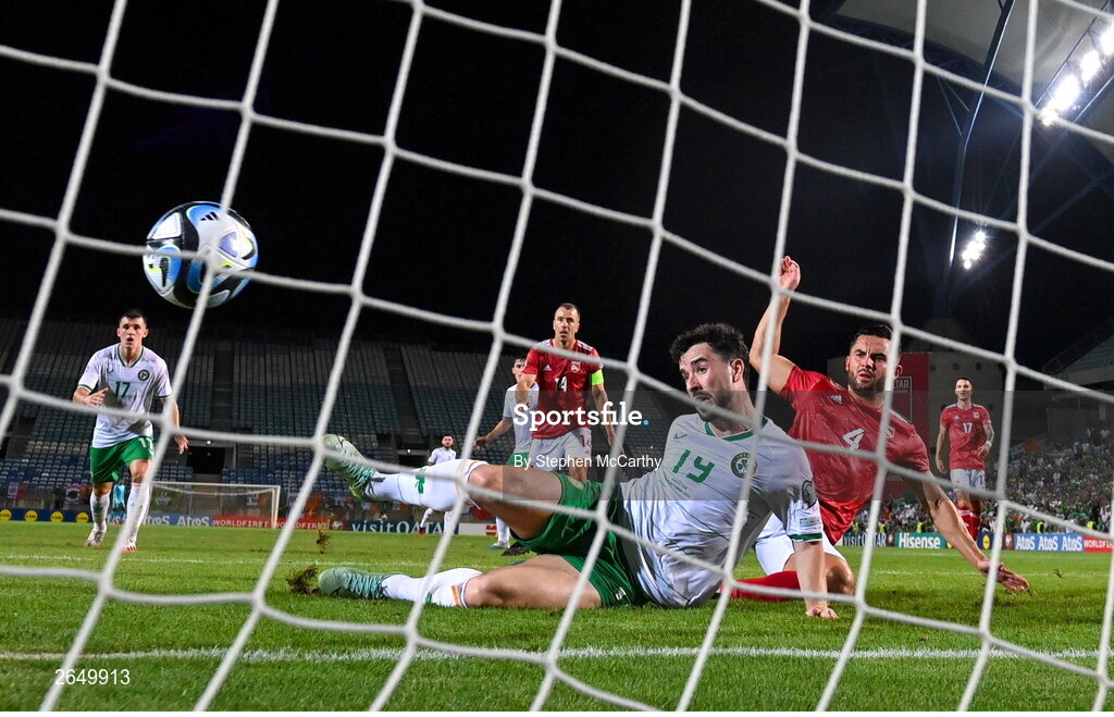 16 October 2023; Mikey Johnston of Republic of Ireland scores his side's second goal despite the attention of John Sergeant of Gibraltar during the UEFA EURO 2024 Championship qualifying group B match between Gibraltar and Republic of Ireland at Estádio Algarve in Faro, Portugal. Photo by Stephen McCarthy/Sportsfile