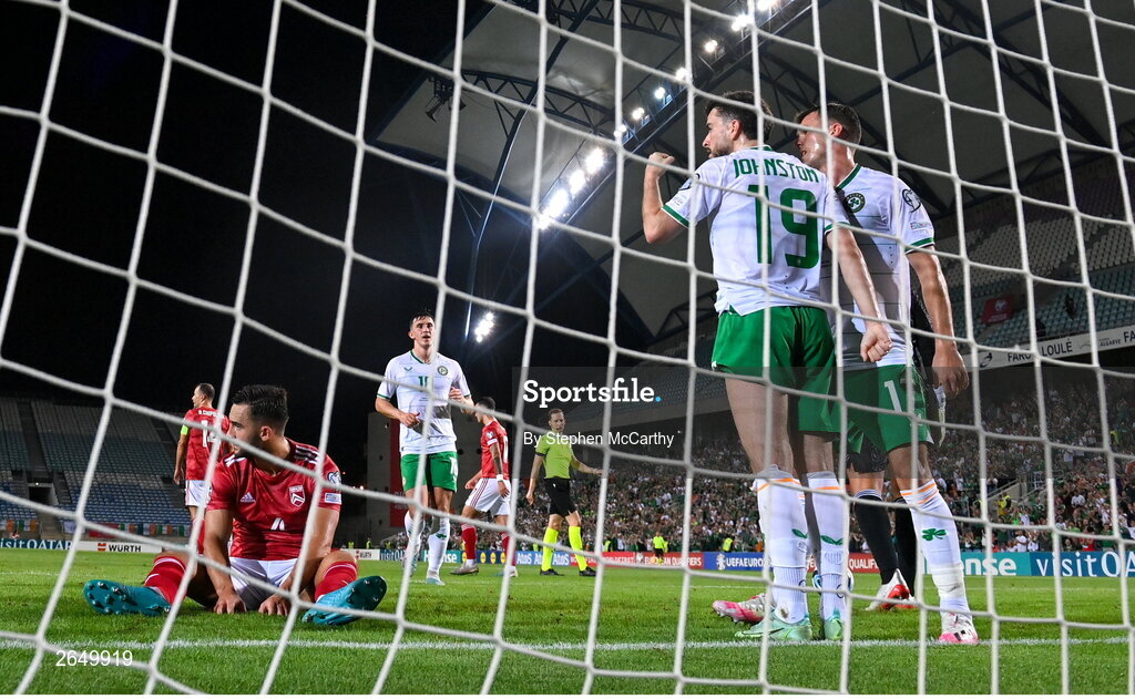 16 October 2023; Mikey Johnston of Republic of Ireland, 19, celebrates with teammate Jason Knight after scoring their side's second goal during the UEFA EURO 2024 Championship qualifying group B match between Gibraltar and Republic of Ireland at Estádio Algarve in Faro, Portugal. Photo by Stephen McCarthy/Sportsfile