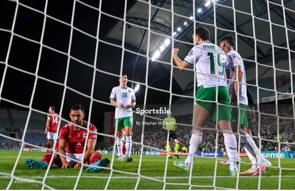 16 October 2023; Mikey Johnston of Republic of Ireland, 19, celebrates with teammate Jason Knight after scoring their side's second goal during the UEFA EURO 2024 Championship qualifying group B match between Gibraltar and Republic of Ireland at Estádio Algarve in Faro, Portugal. Photo by Stephen McCarthy/Sportsfile