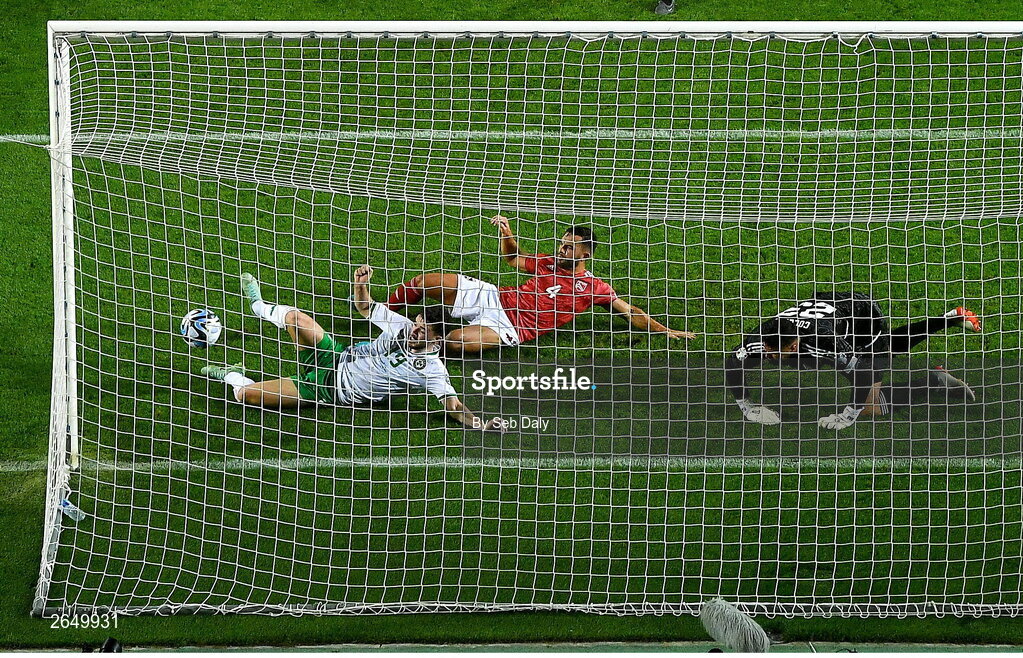 16 October 2023; Mikey Johnston of Republic of Ireland scores his side's second goal despite the attention of John Sergeant of Gibraltar during the UEFA EURO 2024 Championship qualifying group B match between Gibraltar and Republic of Ireland at Estádio Algarve in Faro, Portugal. Photo by Seb Daly/Sportsfile