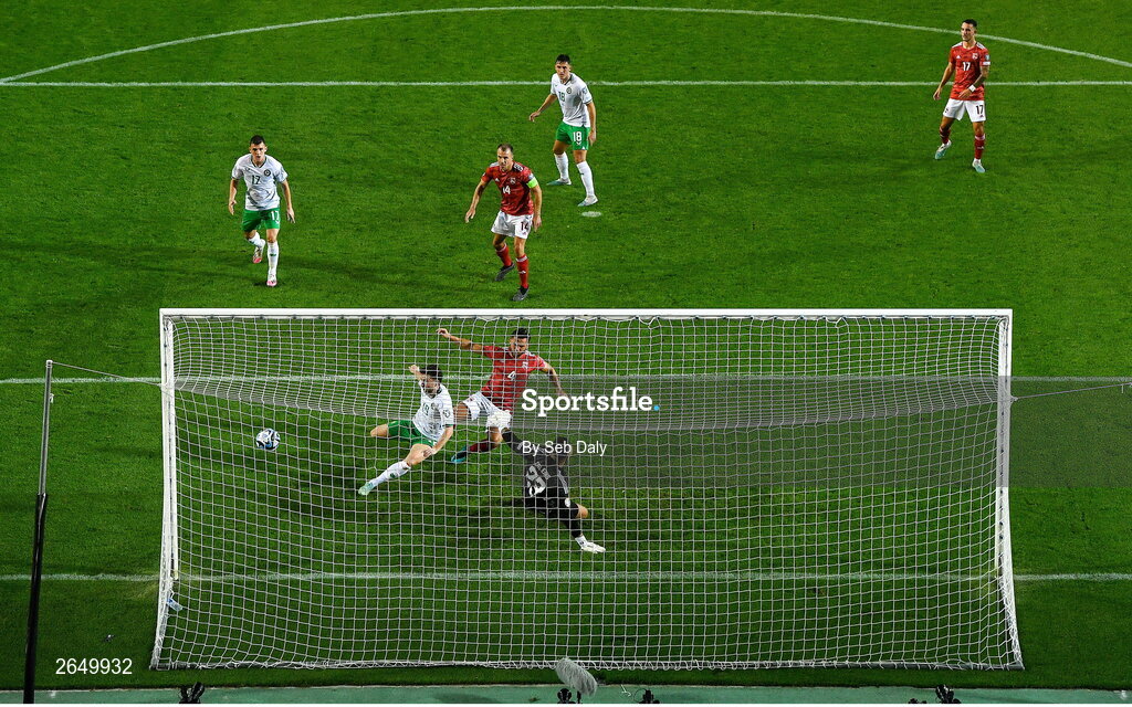 16 October 2023; Mikey Johnston of Republic of Ireland scores his side's second goal despite the attention of John Sergeant of Gibraltar during the UEFA EURO 2024 Championship qualifying group B match between Gibraltar and Republic of Ireland at Estádio Algarve in Faro, Portugal. Photo by Seb Daly/Sportsfile