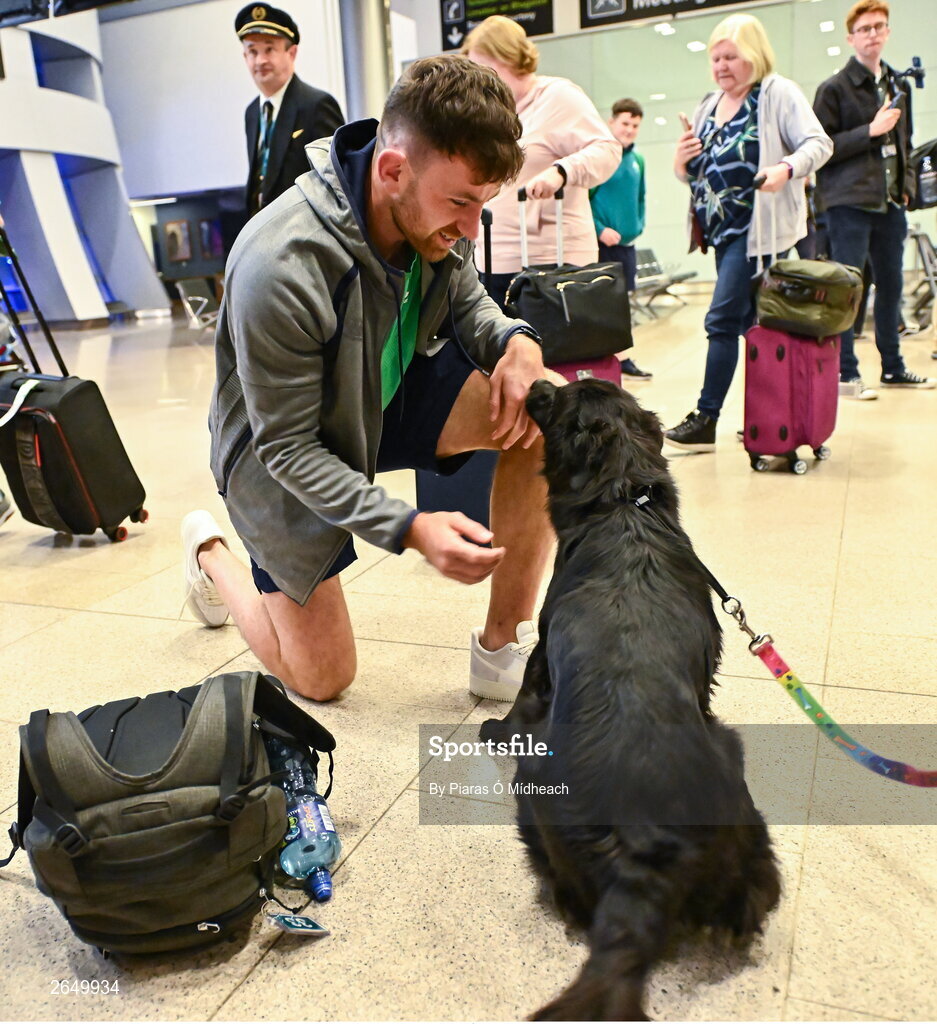 16 October 2023; Hugo Keenan of Ireland is greeted by his dog Archie on the Ireland rugby teams arrival at Dublin Airport from the 2023 Rugby World Cup in France. Photo by Piaras Ó Mídheach/Sportsfile