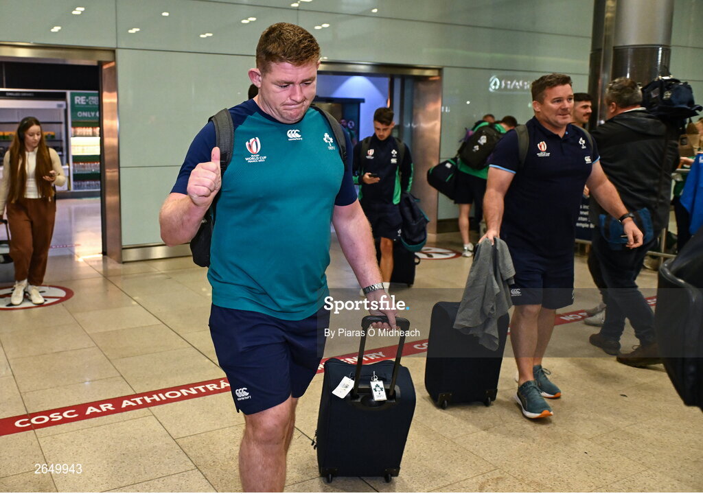 16 October 2023; Tadhg Furlong of Ireland on the teams return at Dublin Airport from the 2023 Rugby World Cup in Paris, France. Photo by Piaras Ó Mídheach/Sportsfile