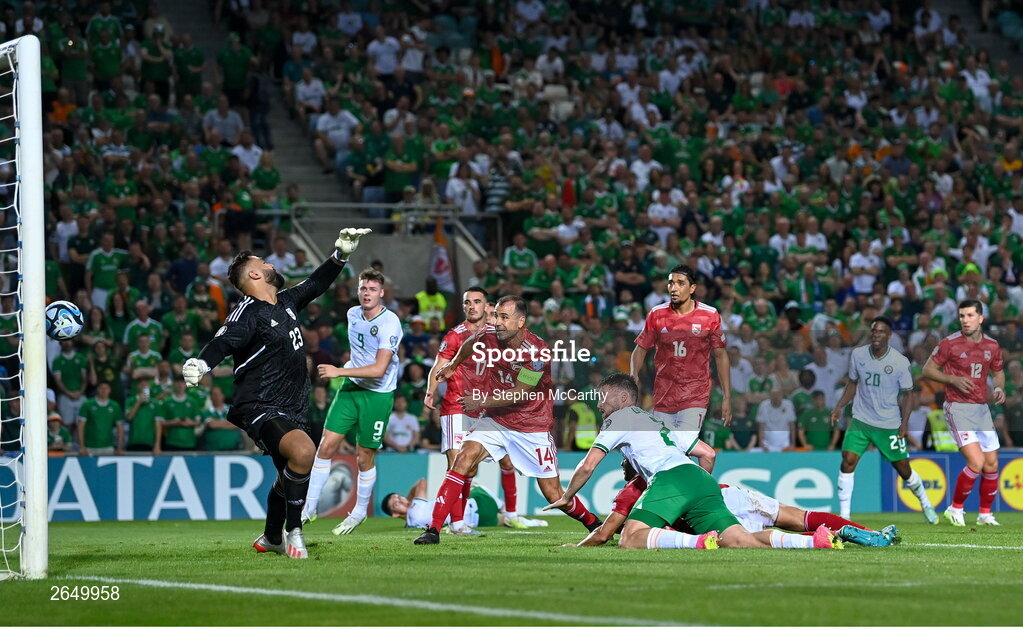 16 October 2023; Matt Doherty of Republic of Ireland scores his side's third goal during the UEFA EURO 2024 Championship qualifying group B match between Gibraltar and Republic of Ireland at Estádio Algarve in Faro, Portugal. Photo by Stephen McCarthy/Sportsfile
