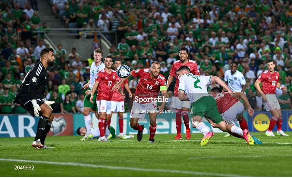 16 October 2023; Matt Doherty of Republic of Ireland scores his side's third goal during the UEFA EURO 2024 Championship qualifying group B match between Gibraltar and Republic of Ireland at Estádio Algarve in Faro, Portugal. Photo by Stephen McCarthy/Sportsfile