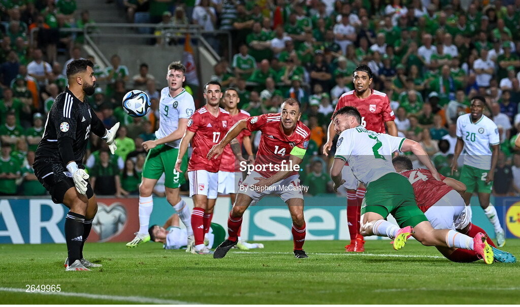 16 October 2023; Matt Doherty of Republic of Ireland scores his side's third goal during the UEFA EURO 2024 Championship qualifying group B match between Gibraltar and Republic of Ireland at Estádio Algarve in Faro, Portugal. Photo by Stephen McCarthy/Sportsfile