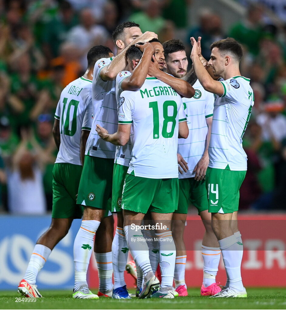 16 October 2023; Republic of Ireland players celebrate their fourth goal, scored by Callum Robinson, centre, during the UEFA EURO 2024 Championship qualifying group B match between Gibraltar and Republic of Ireland at Estádio Algarve in Faro, Portugal. Photo by Stephen McCarthy/Sportsfile