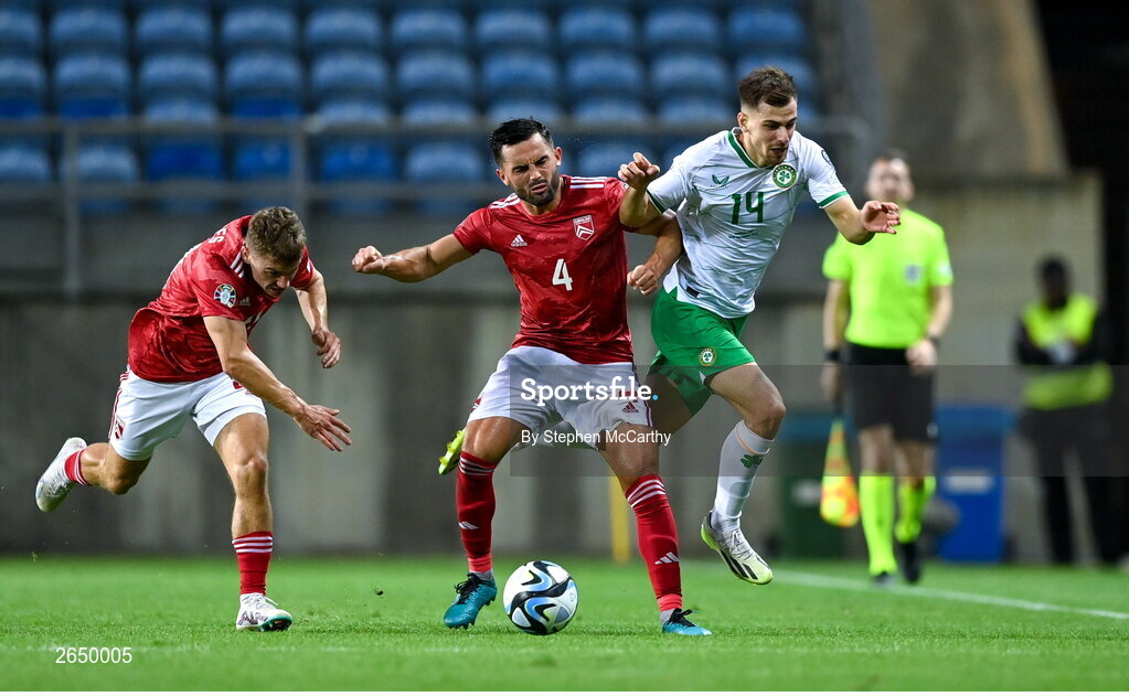 16 October 2023; Jayson Molumby of Republic of Ireland in action against John Sergeant of Gibraltar during the UEFA EURO 2024 Championship qualifying group B match between Gibraltar and Republic of Ireland at Estádio Algarve in Faro, Portugal. Photo by Stephen McCarthy/Sportsfile