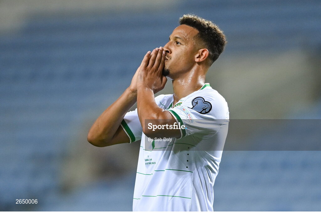 16 October 2023; Callum Robinson of Republic of Ireland celebrates after scoring his side's fourth goal during the UEFA EURO 2024 Championship qualifying group B match between Gibraltar and Republic of Ireland at Estádio Algarve in Faro, Portugal. Photo by Seb Daly/Sportsfile