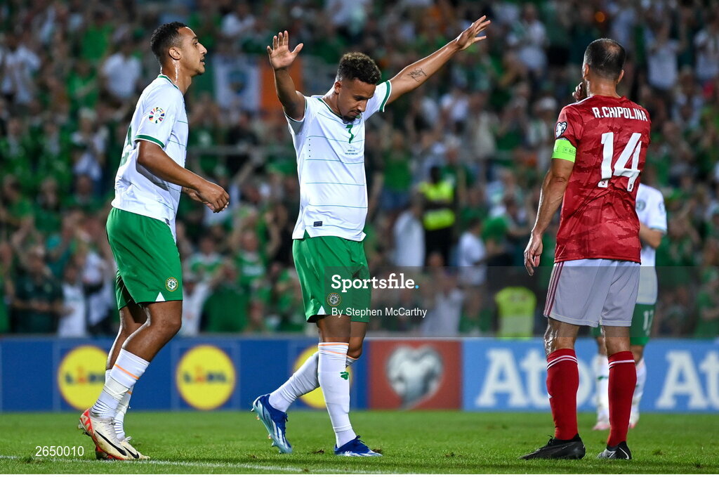 16 October 2023; Callum Robinson of Republic of Ireland celebrates after scoring his side's fourth goal during the UEFA EURO 2024 Championship qualifying group B match between Gibraltar and Republic of Ireland at Estádio Algarve in Faro, Portugal. Photo by Stephen McCarthy/Sportsfile