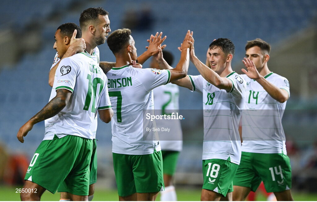 16 October 2023; Callum Robinson of Republic of Ireland, 7, celebrates with teammates, from left, Adam Idah, Shane Duffy, Jamie McGrath and Jayson Molumby during the UEFA EURO 2024 Championship qualifying group B match between Gibraltar and Republic of Ireland at Estádio Algarve in Faro, Portugal. Photo by Seb Daly/Sportsfile