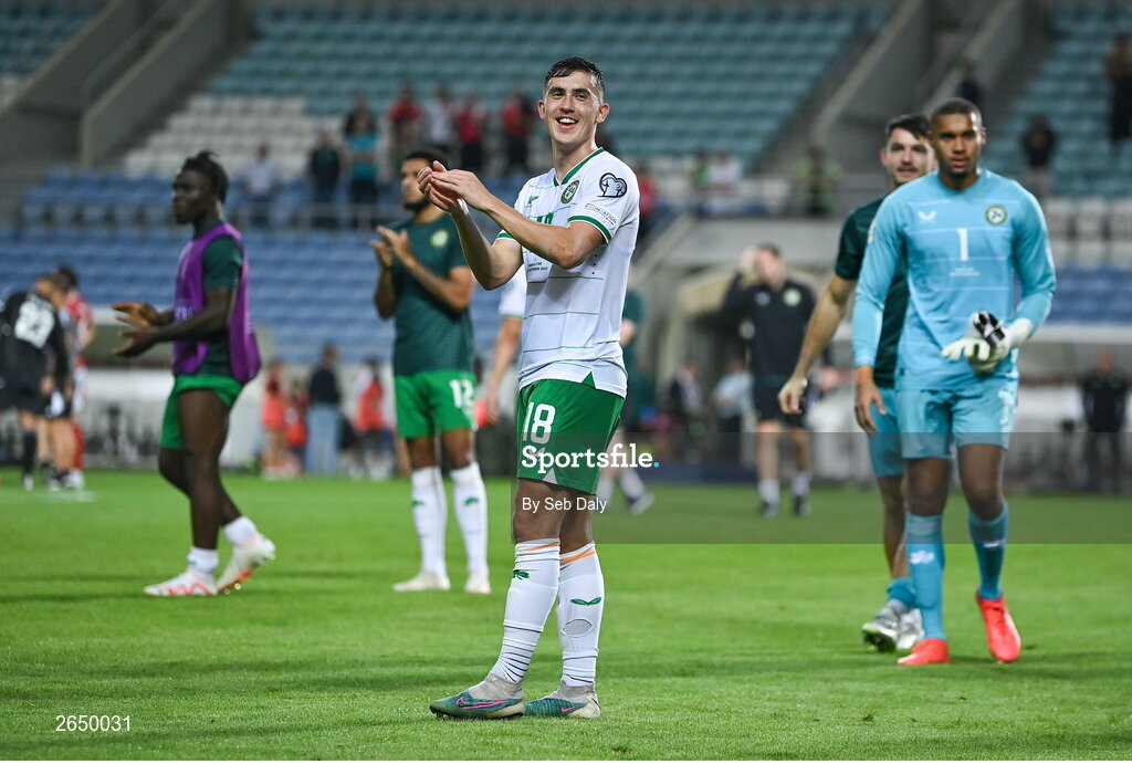16 October 2023; Jamie McGrath of Republic of Ireland celebrates after the UEFA EURO 2024 Championship qualifying group B match between Gibraltar and Republic of Ireland at Estádio Algarve in Faro, Portugal. Photo by Seb Daly/Sportsfile