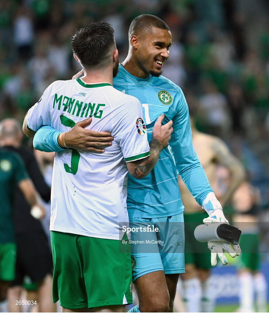 16 October 2023; Republic of Ireland goalkeeper Gavin Bazunu celebrates with Ryan Manning after the UEFA EURO 2024 Championship qualifying group B match between Gibraltar and Republic of Ireland at Estádio Algarve in Faro, Portugal. Photo by Stephen McCarthy/Sportsfile